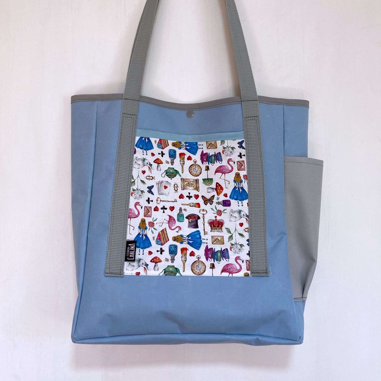 El Aruma Bag Alicia es un bolso de hombro con cuatro bolsillos donde puedes llevar  tus cuadernos, notebook/laptop, libros, botella para el agua y mucho más c: Es el bolso favorito de las profes por su capacidad c: La tela estampada es inspirada en Alicia en el país de las maravillas, 100% algodón importado desde UK.