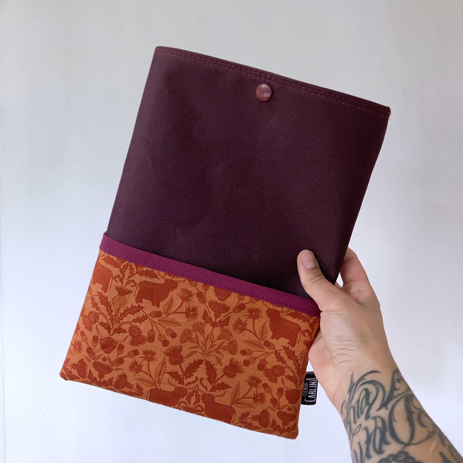 Funda para libros en tela estampada de la flor thistle y vaquitas de las Tierras Altas de Escocia.