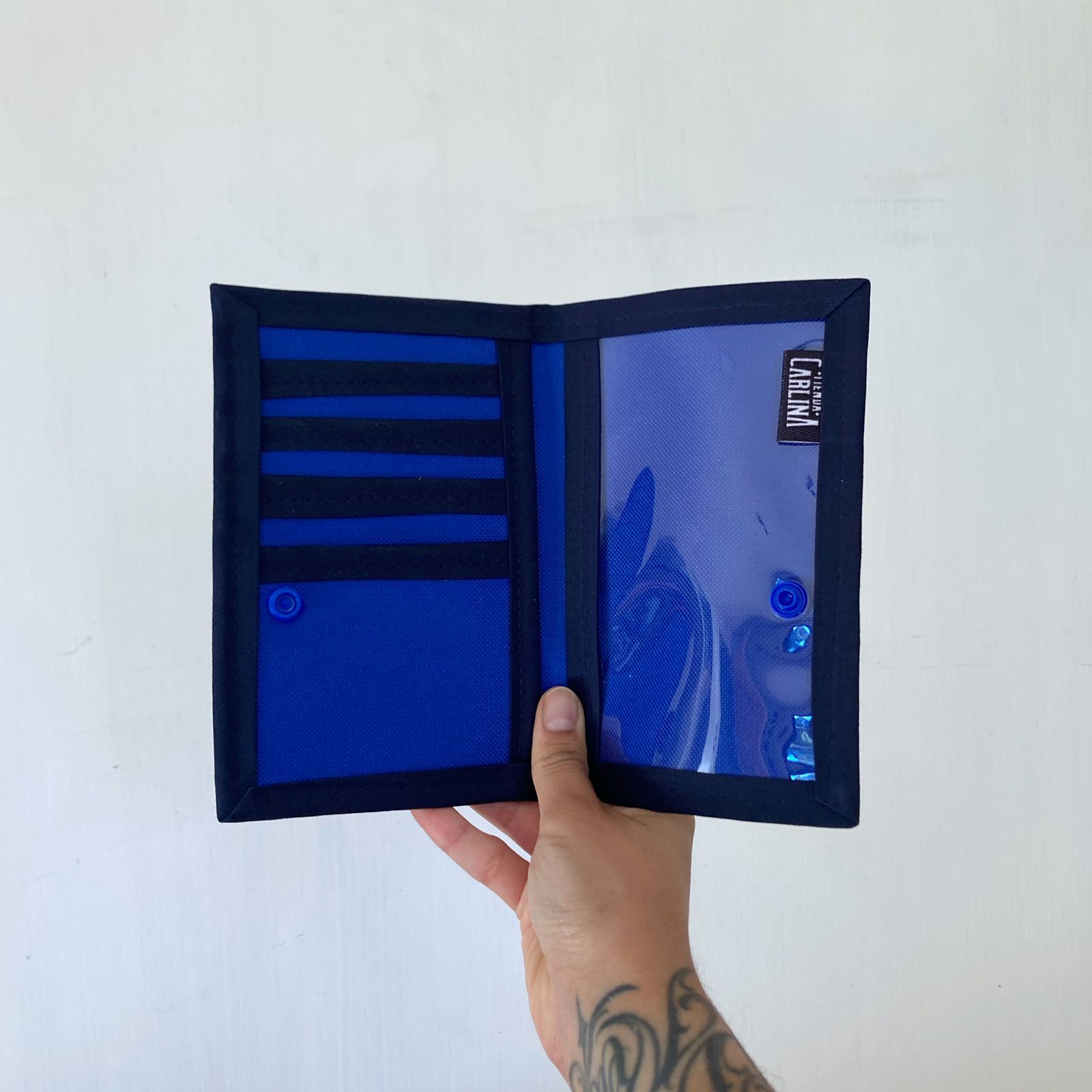 Portapasaporte con seis bolsillos: cinco en tela y uno en mica transparente. Se cierra con broche.
