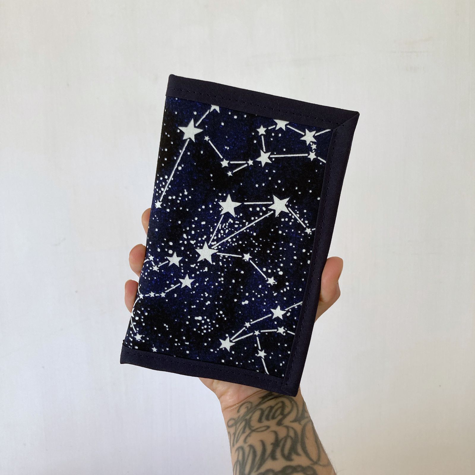 El portapasaporte Estrellas tiene seis bolsillos para guardar tu pasaporte, tarjetas y alguna que otra fotito. La tela brilla en la oscuridad.
